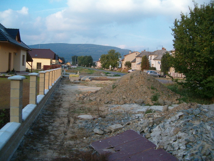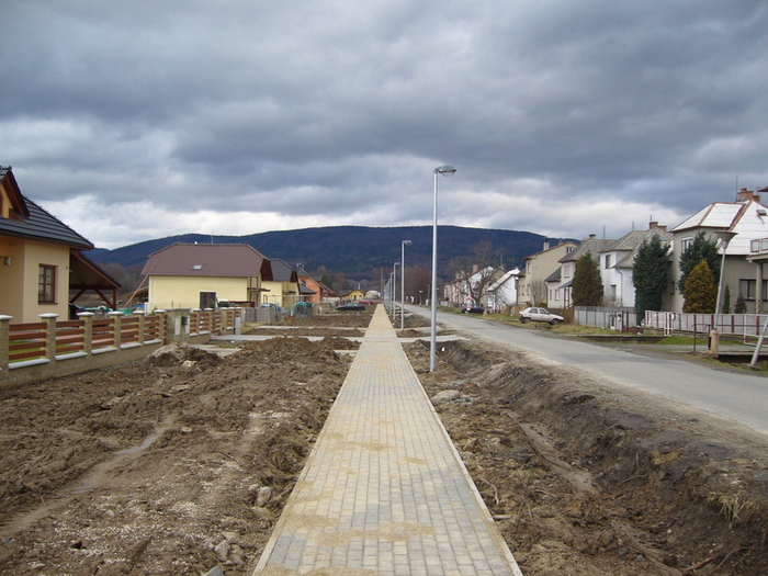 Úvod > Rozvoj obce > Bydlení a Kultura > Zástavba k nádraží v roce 2006 před výstavbou chodníku a po jeho dokončení.